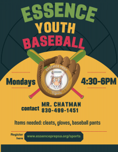 Essence Prep will offer Baseball, Cheerleading and Martial Artsfor enrolled scholars in grades 2nd – 5th every Monday starting October 24th. Participants are asked to come with a change of clothes and tennis shoes and gloves (if able). Transportation is not provided.